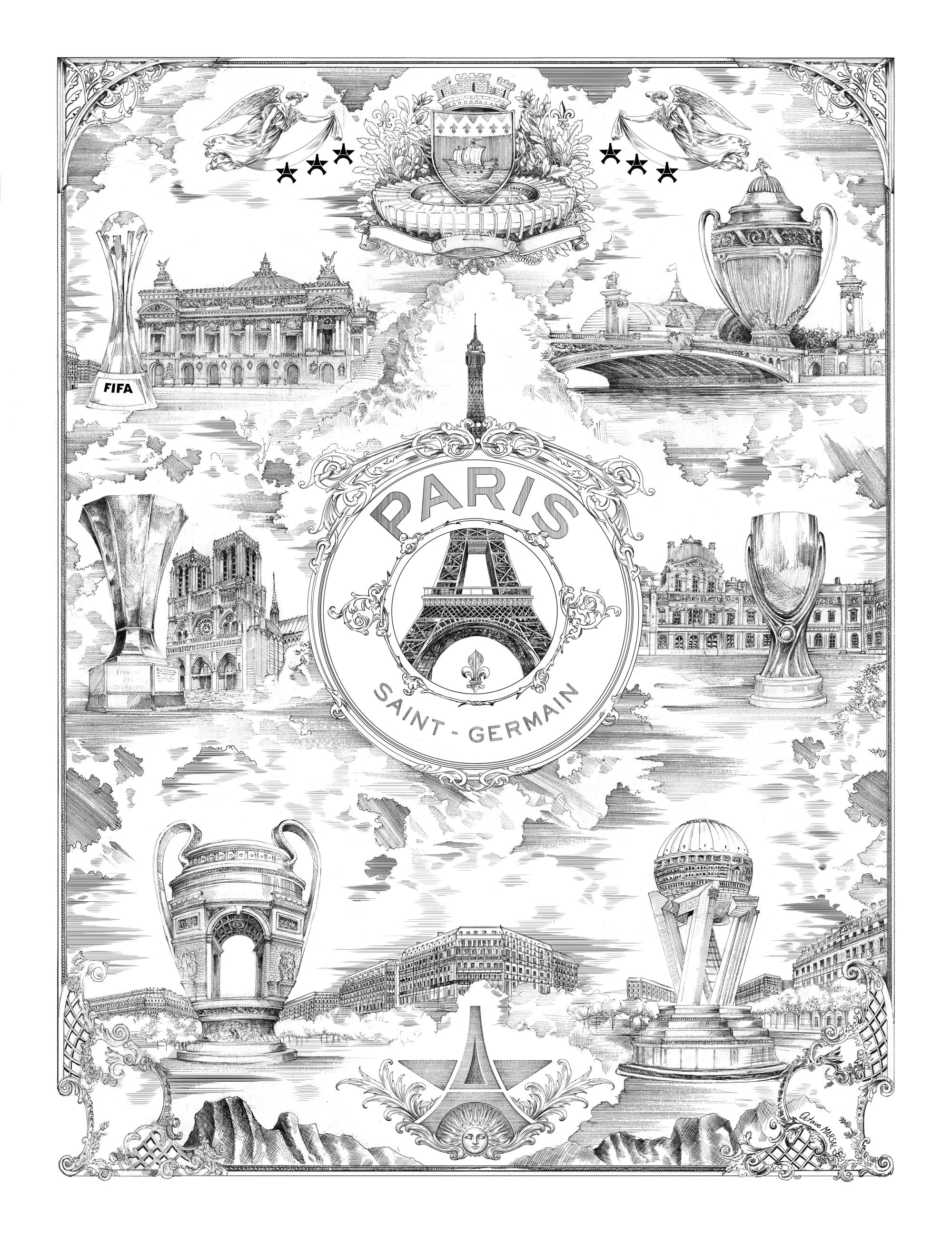 L’affiche, intitulée “Allégorie Parisienne” et dessinée par l’artiste français Octave Marsal, designer pour des marques de renom, célèbre les 6 trophées gagnés par le Paris Saint-Germain au cours de l’année 2025 : la Ligue des Champions, la Supercoupe d'Europe, la Coupe Intercontinentale, la Ligue 1, la Coupe de France et le Trophée des champions. Fidèle à son univers mêlant architecture, dessin classique et imaginaire, Octave Marsal propose une cartographie symbolique où chaque trophée dialogue avec un monument parisien, du Parc des Princes à l’Arc de Triomphe. Un sextuplé historique du Paris Saint-Germain mis à l'honneur à travers une œuvre graphique riche et immersive.
